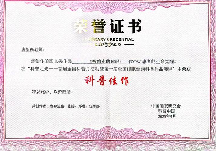 近日,在中国睡眠研究会与科普中国联合主办的“助力健康中国 睡眠科普先行”第一届全国睡眠健康科普作品征集活动中,南华大学附属南华医院呼吸与危重症医学科创作的科普作品《被偷走的睡眠:一位OSA患者的生命觉醒》荣获“科普佳作”奖。