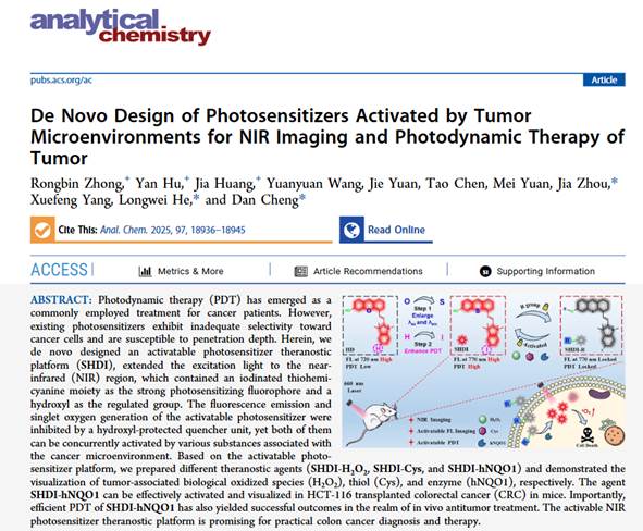 光动力疗法(PDT)作为一种微创、低毒且具有时空可控性的治疗手段,在肿瘤治疗领域展现出广阔前景。然而,传统光敏剂对肿瘤组织缺乏特异性识别,限制了其在临床中的广泛应用。为此,我们成功构建了一种基于碘化硫代半花菁的可激活近红外光敏剂诊疗平台(SHDI)。该平台不仅具备3.23%的单线态氧产率,还表现出优异的组织穿透能力和光稳定性。通过SHDI上羟基的保护与脱保护策略,进一步开发出三种可激活型光敏探针SHDI-H2O2、SHDI-Cys与SHDI-hNQO1。在正常组织中,这些探针的荧光发射与光动力活性因识别基团的淬灭作用而处于“关闭”状态;一旦进入肿瘤微环境,它们可被相应的肿瘤相关物质特异性激活,同步恢复近红外荧光与光动力活性,从而实现高信噪比的肿瘤成像与精准治疗。在HCT-116移植瘤模型中,SHDI-hNQO1展现出显著的光动力治疗效果,验证了该平台在活体内的应用潜力。综上所述,这一可激活近红外光敏剂诊疗平台为肿瘤的精准诊断与高效治疗提供了新的策略,具有重要的临床转化价值。