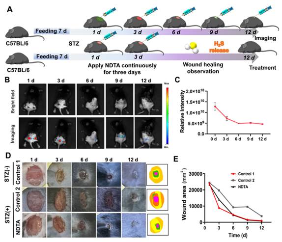 在本研究中,团队创新性地开发了一种基于H2O2激活H2S供体的诊疗一体化近红外荧光试剂(NDTA),通过动态可视化双氧水梯度和靶向病灶原位给药,实现对糖尿病慢性伤口的即时诊断和修复治疗。NDTA系统采用五氟苯磺酸盐作为H2O2特异性响应单元,通过电子重排触发的分子开关实现其双重功能:(1)H2O2监测:实时表征伤口部位的H2O2浓度,反映在719纳米近红外发射的强度变化中;(2)按需释放H2S:激活自焚级联反应,精确地释放羰基硫(COS),随即在碳酸酐酶(CA)催化下能够迅速转化为H2S。组织测序分析结果表明, H2S促进伤口修复的分子机制主要与其对肿瘤坏死因子信号通路的调节有关。该技术通过将H2O2引导的荧光成像与时空控制的H2S释放相结合,克服了传统诊断-治疗分离的局限性,为糖尿病创面管理的精准医疗提供了微环境适应性诊断平台。