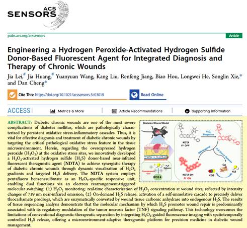 Integrated Diagnosis and Therapy of Chronic Wounds” 为题于近期在线发表在ACS Sensors上。南华大学附属南华医院硕士研究生雷佳、南华大学博士后黄佳为论文的共同第一作者,谢松林教授和程丹研究员为论文的共同通讯作者,南华大学附属南华医院为第一通讯单位。该研究得到了南华大学药学院何隆薇教授的大力支持,以及湖南省自然科学基金,湖南省手部足部创伤修复与功能重建临床研究中心,国家重点临床专科重大科学研究项目的支持。