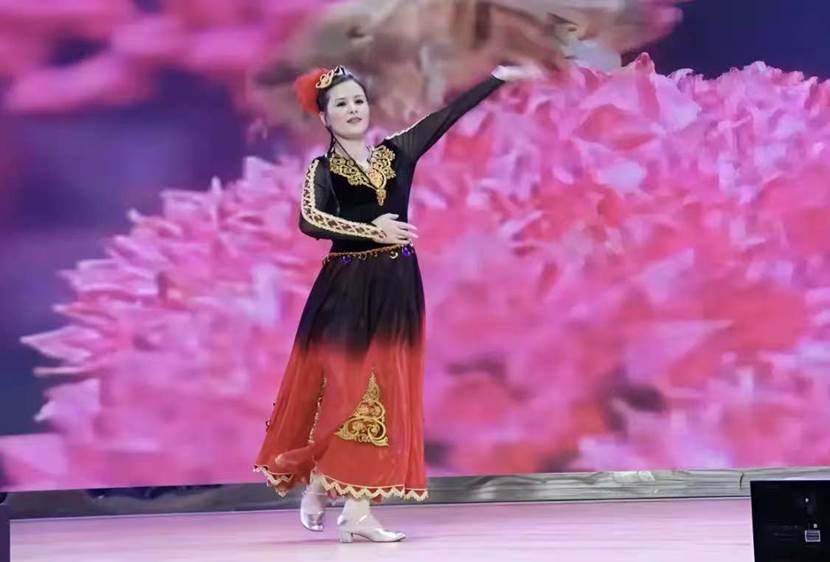 展演环节在热烈的氛围中拉开帷幕。特邀嘉宾——新疆鄯善县鲁克沁镇第二中学音乐教师、木卡姆传承人谢日排姆·苏力坦带来的独舞《且比耶特木卡姆・朱拉》成为亮点。她身着精美民族服饰,以精湛舞姿展现木卡姆文化的独特魅力,赢得现场观众经久不息的掌声。